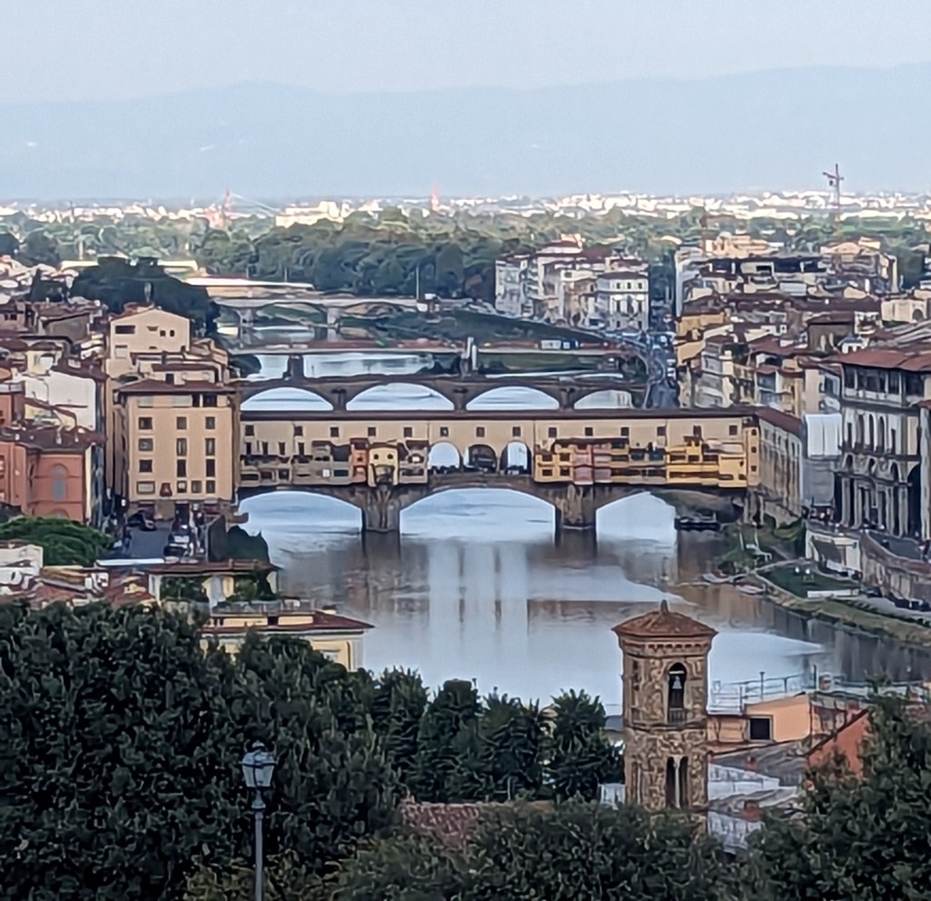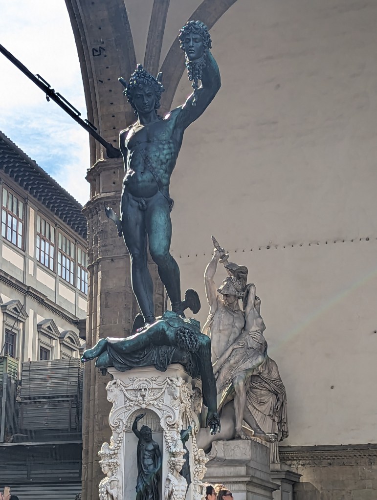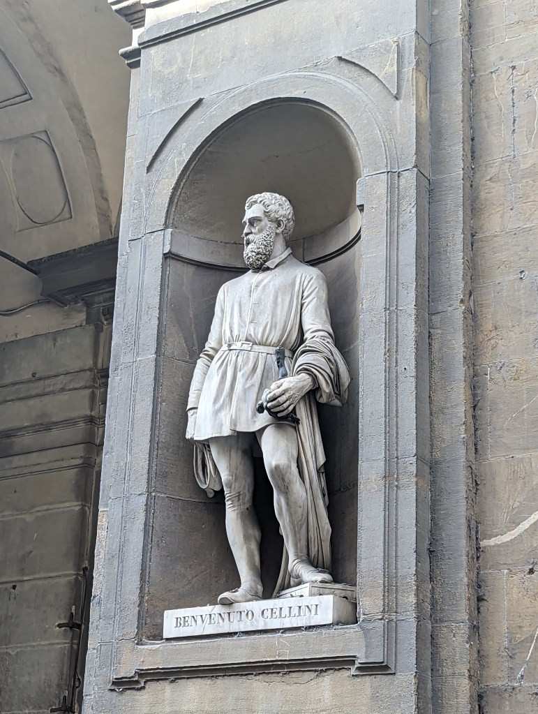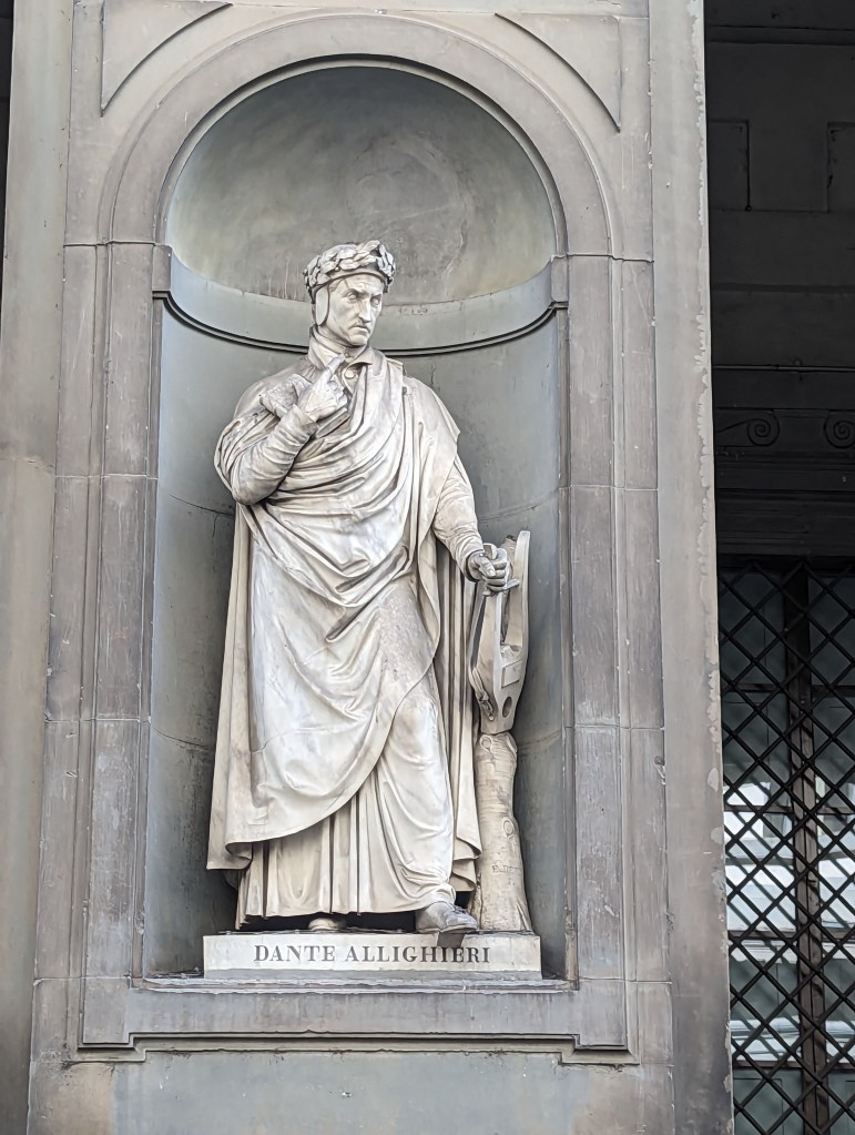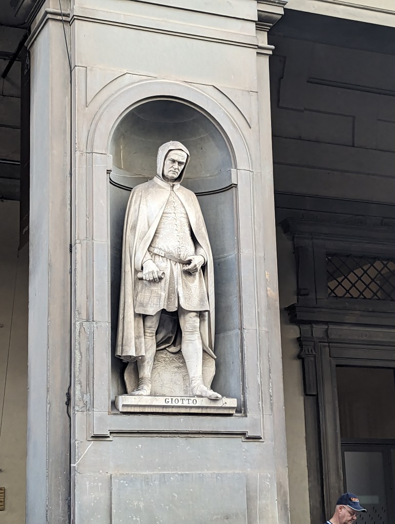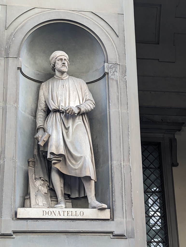 Wasn’t able to get last minute tickets for the Uffizi Gallery. Disappointing, but Joe and I had been there before, though decades ago. However we saw several of the 28 statues of famous Renaissance celebrities in the niches of the Uffizi colonnade.