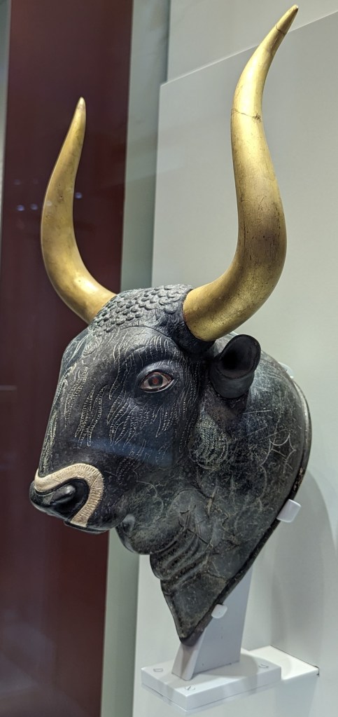 The image of the bull is found in many forms in Minoan art: jewelry, figurines, frescos, pottery, ritual pouring vessels and sarcophagi. In Greek mythology, King Minos, the ruler of Crete, dwelt in the palace at Knossos. He had his architect, Daedalus, construct a labyrinth, a very large maze to house his son, the Minotaur, a creature with the head and tail of a bull and the body of a man. The precise meaning of the bull image in the Minoan culture is speculative. But in other Mediterranean civilizations, the bull was the subject of veneration and worship, a symbol of power and fertility, and the life-giving power of the sun. So we can assume that Minoans also revered the bull in a similar way.