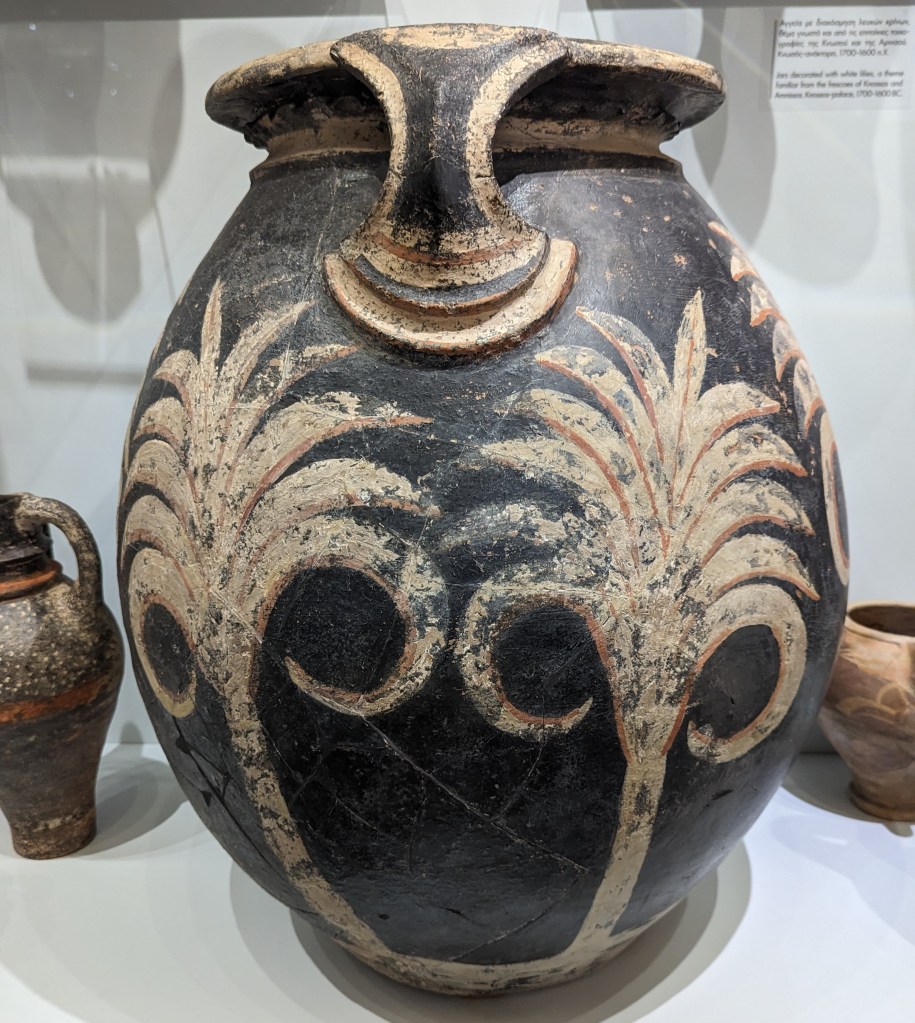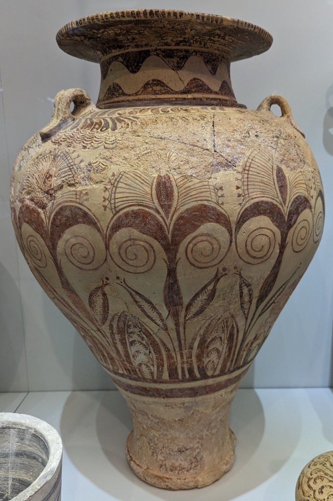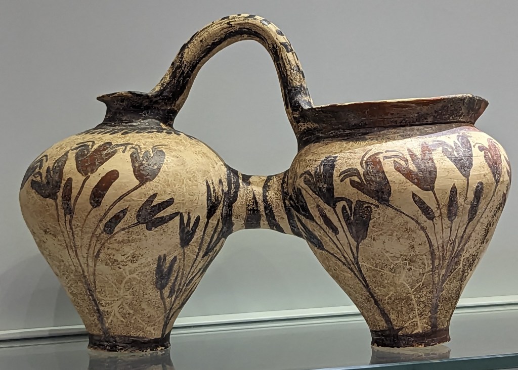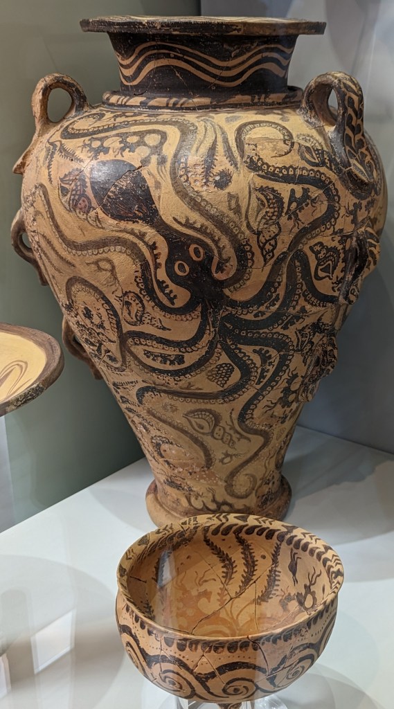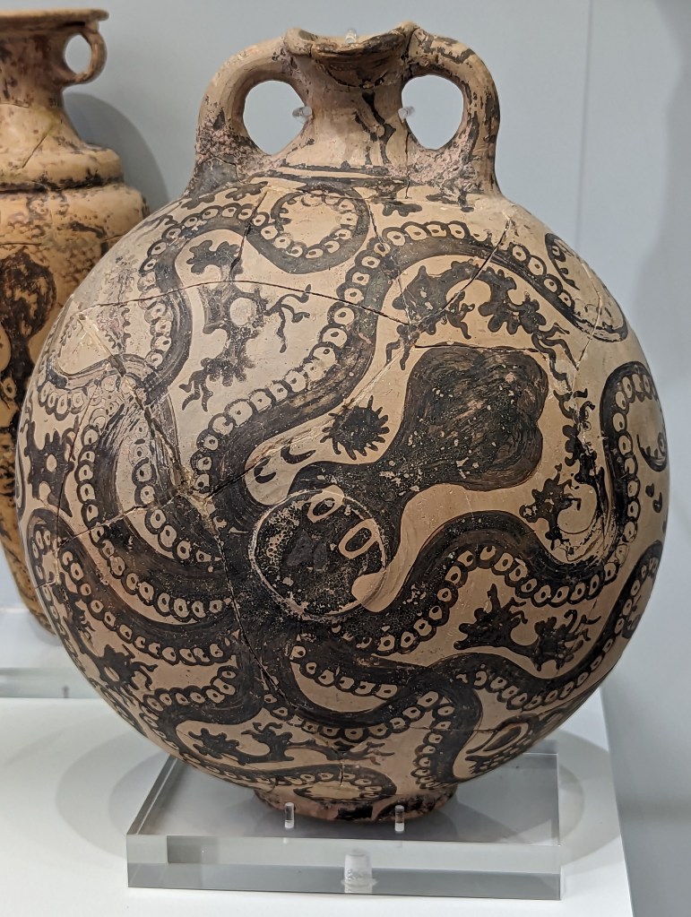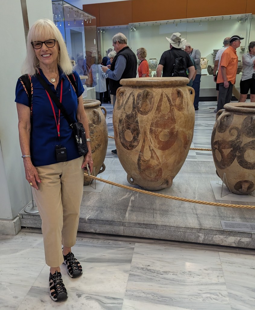 Crete is the largest island in Greece, home to Europe’s earliest recorded civilization, the Minoans (2700 to 1420 BC). As I’ve mentioned before, I love ancient Greek pottery, but I’m especially fond of Minoan pottery. Whereas Classical Greek pottery (480-323 BC) is quite formal and celebrates gods and heroes of war, Minoan pottery is playful and childlike and depicts plant life, animals and ocean creatures in naturalistic and abstract forms. The largest and best collection of Minoan art, including pottery, frescoes, jewelry, figurines, and sarcophagi, is in the Heraklion Archeological Museum on Crete, which was our first stop on our Viking Cruise excursion.