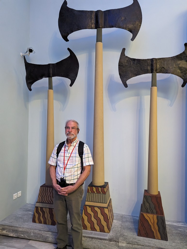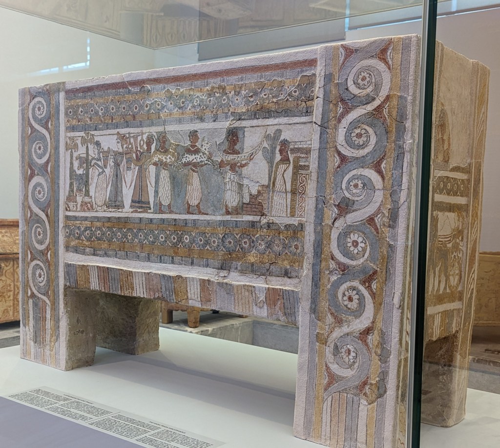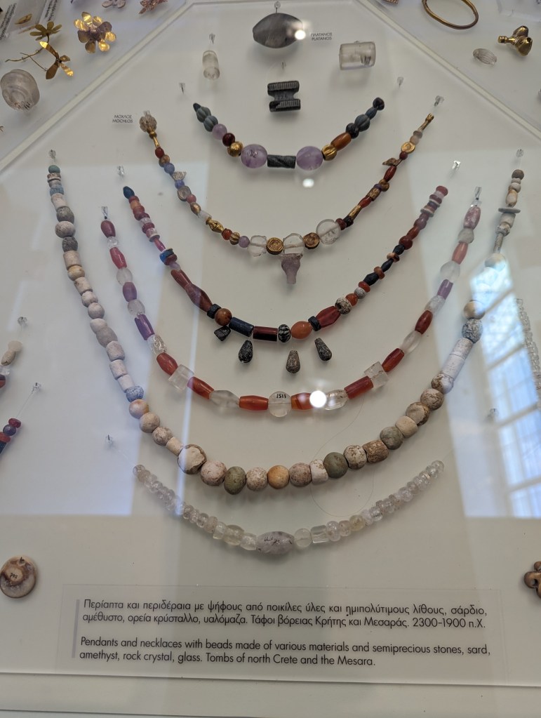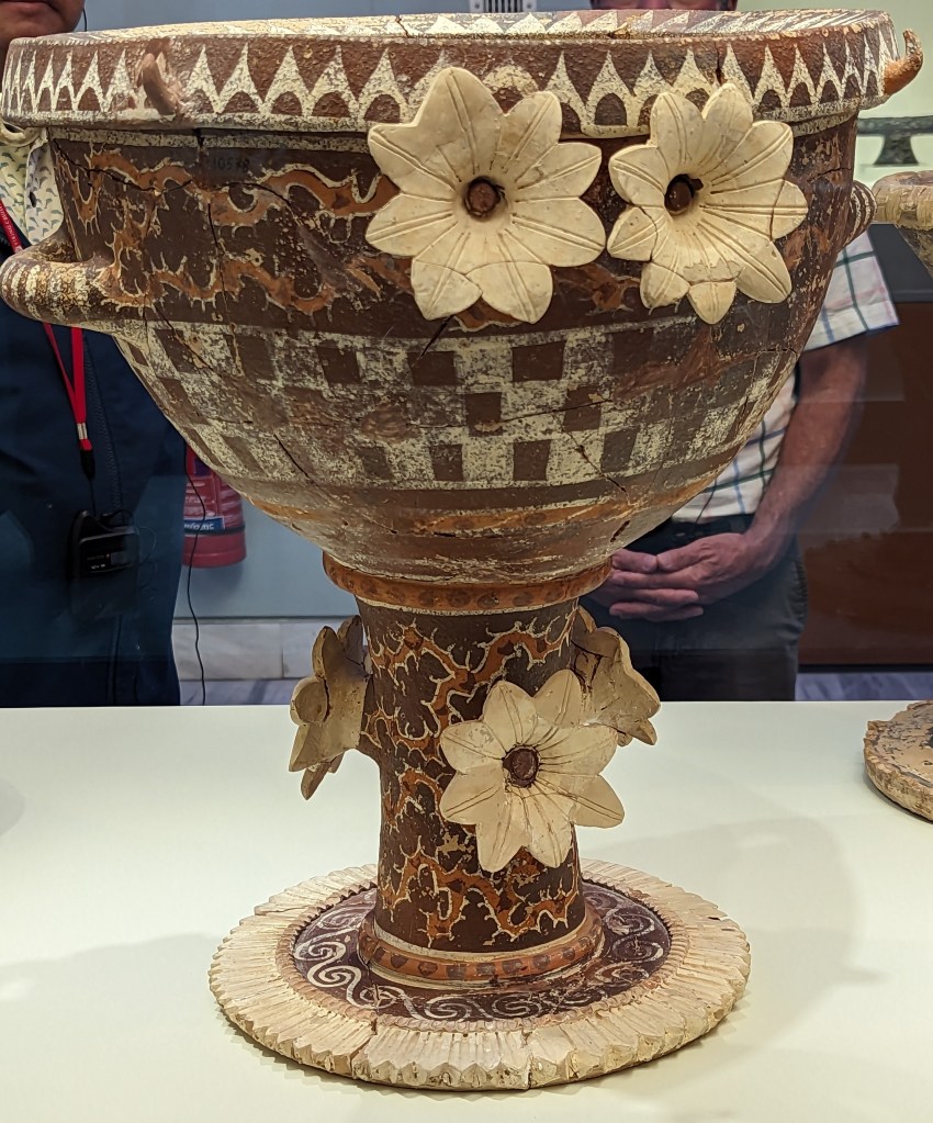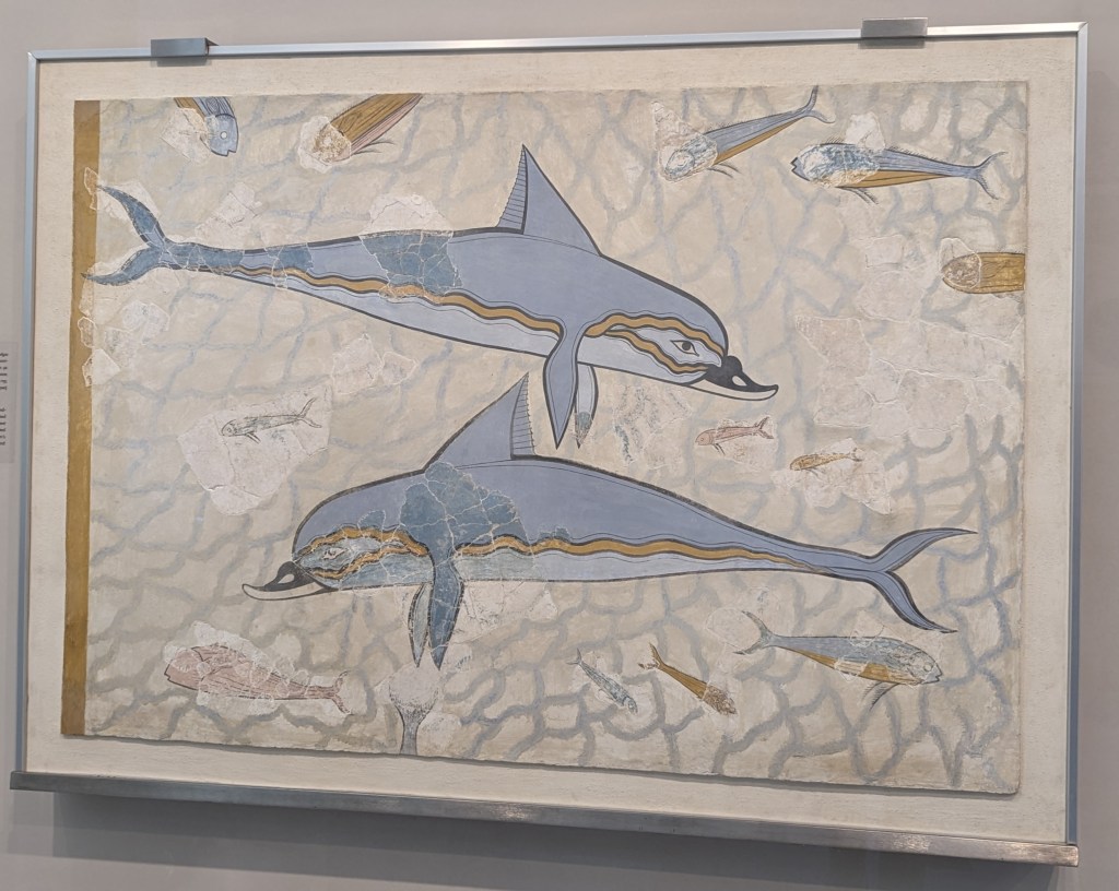 Crete is the largest island in Greece, home to Europe’s earliest recorded civilization, the Minoans (2700 to 1420 BC). As I’ve mentioned before, I love ancient Greek pottery, but I’m especially fond of Minoan pottery. Whereas Classical Greek pottery (480-323 BC) is quite formal and celebrates gods and heroes of war, Minoan pottery is playful and childlike and depicts plant life, animals and ocean creatures in naturalistic and abstract forms. The largest and best collection of Minoan art, including pottery, frescoes, jewelry, figurines, and sarcophagi, is in the Heraklion Archeological Museum on Crete, which was our first stop on our Viking Cruise excursion.