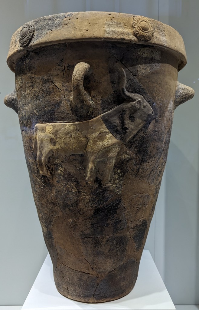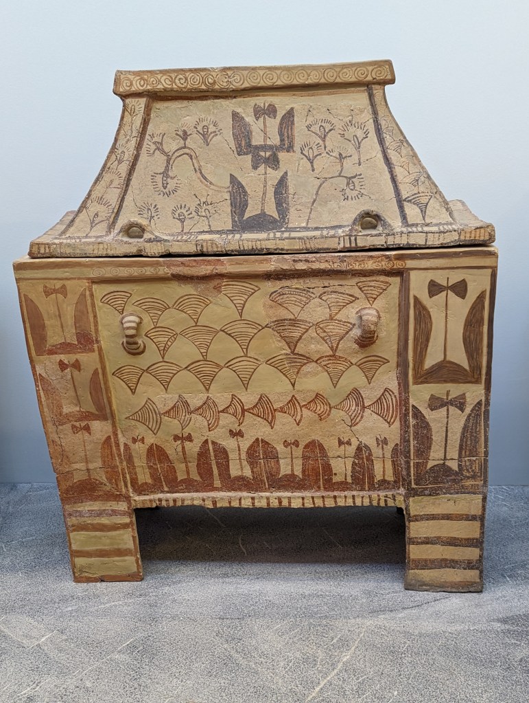 One of the most unusual objects at the museum was the burial pithos, a large jar containing a skeleton in a fetal position. Pithoi were mostly used for storing or shipping wine, olive oil, or grain. Burials in pithoi appear at the end of the Early Minoan period (2000 BC), almost at the same time as burials in a larnax (small closed coffin chest usually of terra cotta). Pithos burials were mostly used for children and infants.