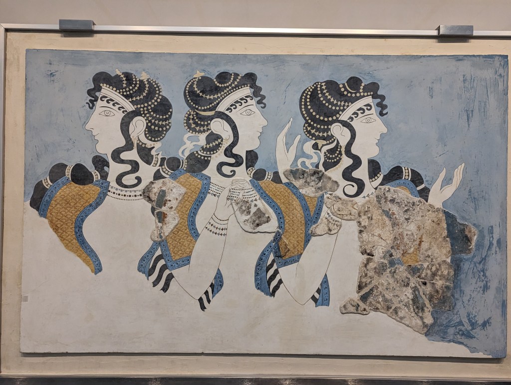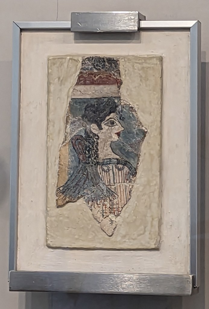The “Ladies in Blue” fresco was also excavated by Evans from the Knossos Palace. The fragments were recreated by Emile Gillieron, a Swiss artist and archaelogist. These women might be goddesses as in the “Snake Goddess” or just noble ladies of the court. They are elaborately clothed and bejeweled. Their gowns expose their bare breasts which was typical of the Neopalatial period (1700 to 1450), a time of opulence and prosperity when the Minoans were at the height of their civilization.