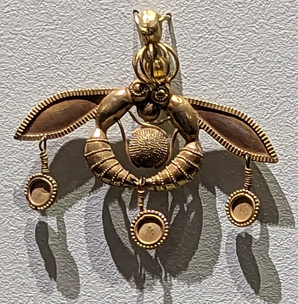 One of the most famous exhibits in the museum is the gold Malia Bees pendant. It was found in a tomb in the Old Palace cemetery at Chrysolakkos, outside the Palace of Malia the third largest Minoan palace. The pendant dates back to the Bronze Age (1800-1700 BC) and depicts two bees carrying a drop of honey to their honeycomb grasped with their legs in the center. Bees were very important in the Minoan matriarchal civilization. They believed that the Great Mother Goddess was related to bees, representing mutual support and fertility. This pendant is evidence of the artist’s mastery of faience or granulation, the technique of soldering tiny pieces of metal on the surface of the cast jewel.
