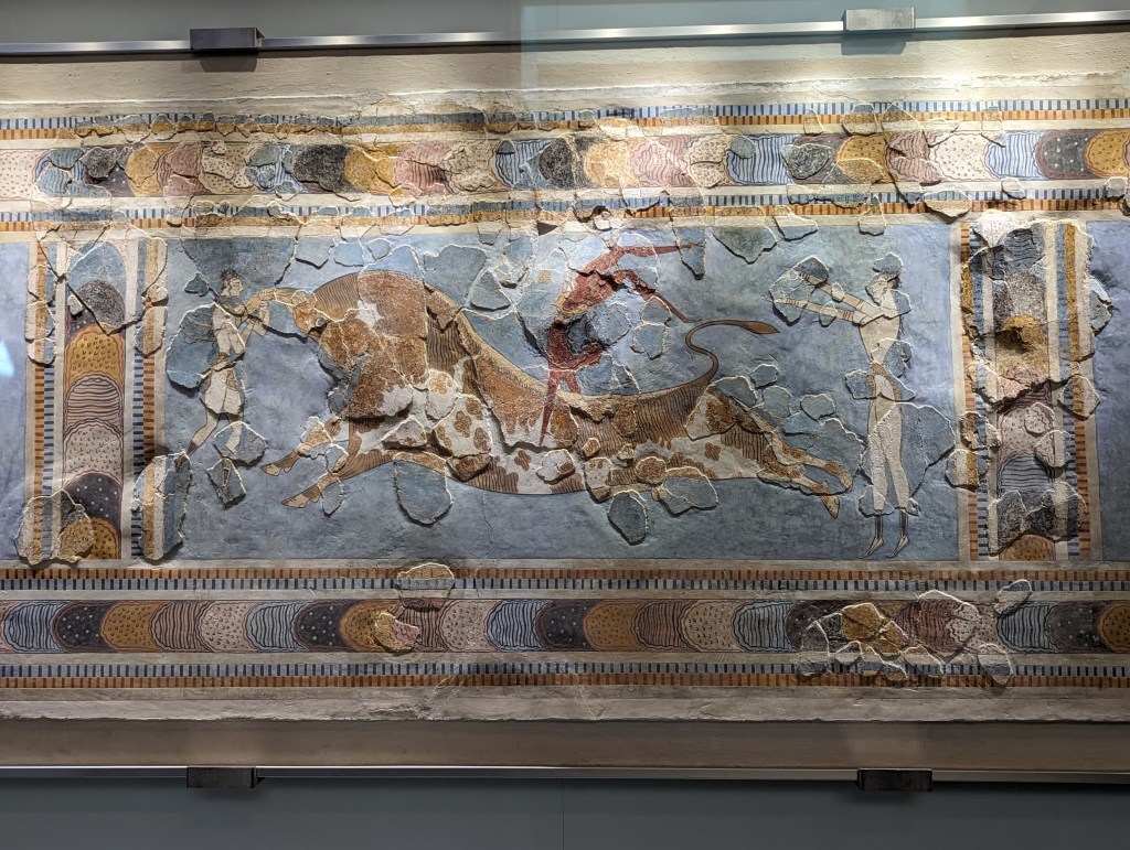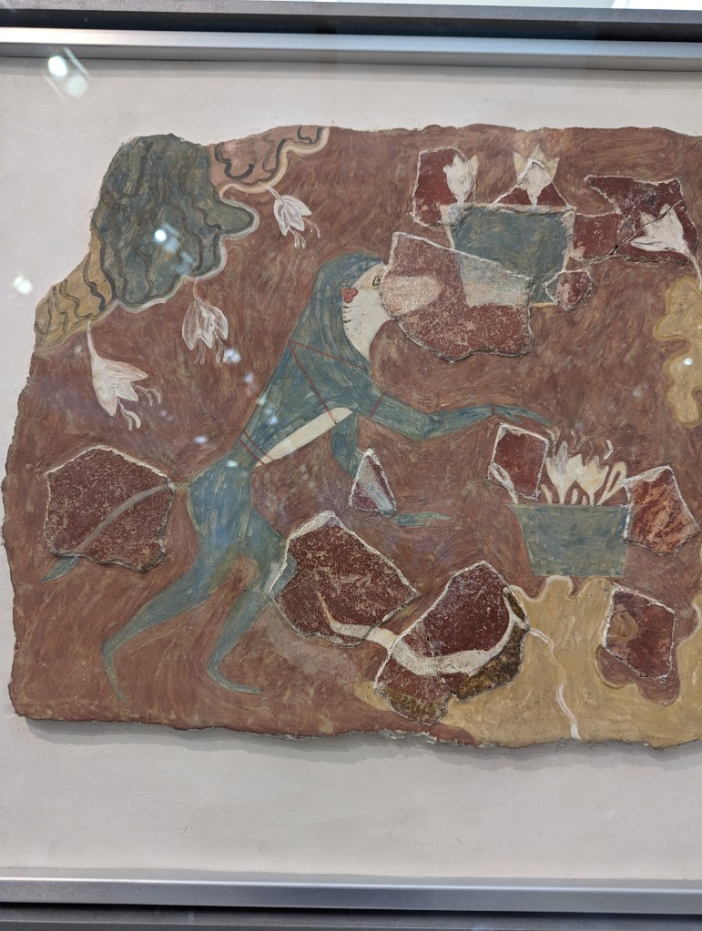 Perhaps the most famous of all the Minoan frescoes is the “Prince of the Lilies.” It was excavated by Evans in pieces from the Knossos Palace, and its reconstruction is in the museum. Much has been written about this fresco, debating his identity and function. Evans initially believed the figure was a boxer, but then changed his mind and called him a “Priest-King,” partly due to the plumed crown. The problem lies in the fact that very few fragments were found, so the reconstruction is controversial. For instance, the reconstruction shows the figure’s left hand is holding a rope which Evans thought might be leading a griffin or sphinx; others have suggested a bull. But the arm was never found, so there’s no evidence the hand was holding a rope at all.