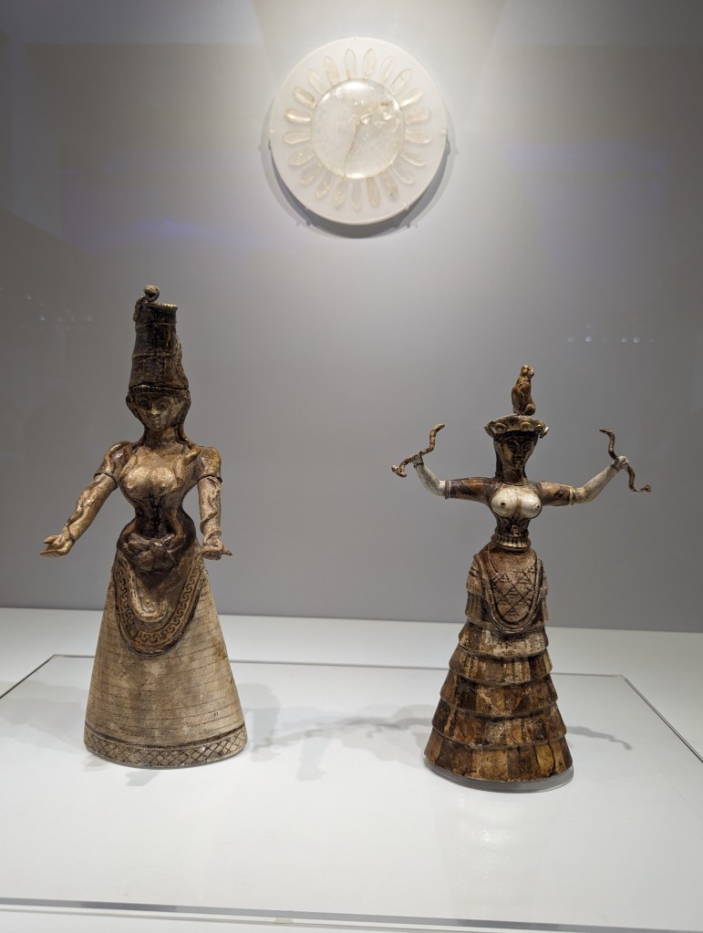 Minoan women appear often in Minoan art, showing their prominent role in Minoan society and religion. One example is the “Snake Goddess” excavated by the British archaeologist Sir Arthur Evans from the Knossos Palace in 1903 in the form of three figurines. Evans called her the “Snake Goddess,” but her function remains unclear.