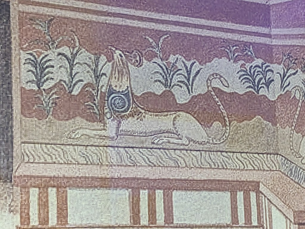 Mythological beasts also appear in Minoan frescoes and reliefs, including the Griffin, with a lion’s body and an eagle’s head. The Minoans believed the Griffin was sacred and symbolic of power, wealth, courage and prestige. It appears on the walls of the Throne Room at Knossos Palace, a chamber built for sacred ceremonials, and on other walls in the palace.