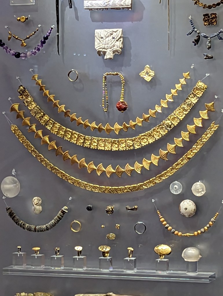 Minoan jewelry also represented nature and demonstrated the Minoans’ command of sophisticated technology influenced by Egypt and the East. They used an array of metals such as gold, silver, and bronze. Also semi-precious stones such as rock crystal, carnelian, garnet, lapis lazuli, obsidian and jasper.