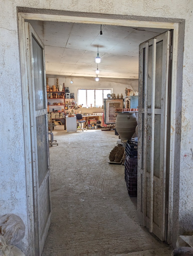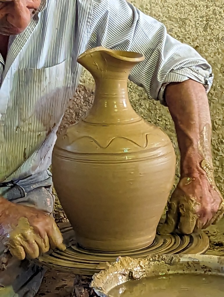 The second part of our excursion was a visit to a Cretan potter in the Thrapsano village. The Thrapsano potters are considered descendants of the Minoans. These potters produce the traditional Minoan storage jars known as pitharia. A potter who has produced pots for 50 years demonstrated making a pouring vessel and a pot.