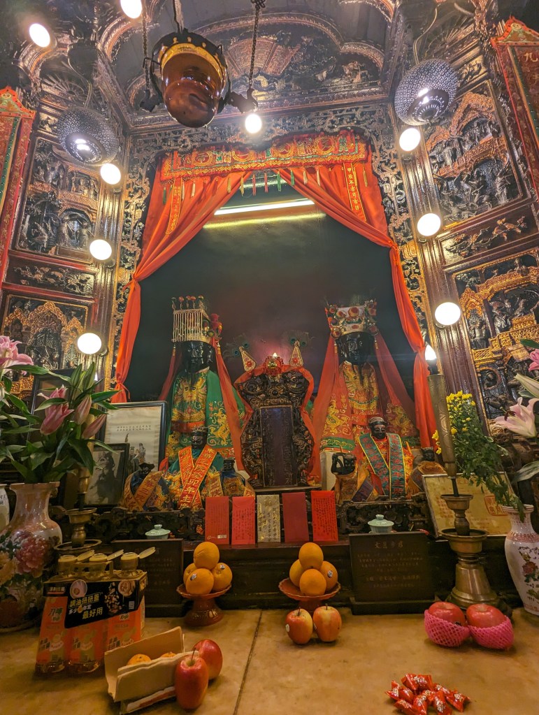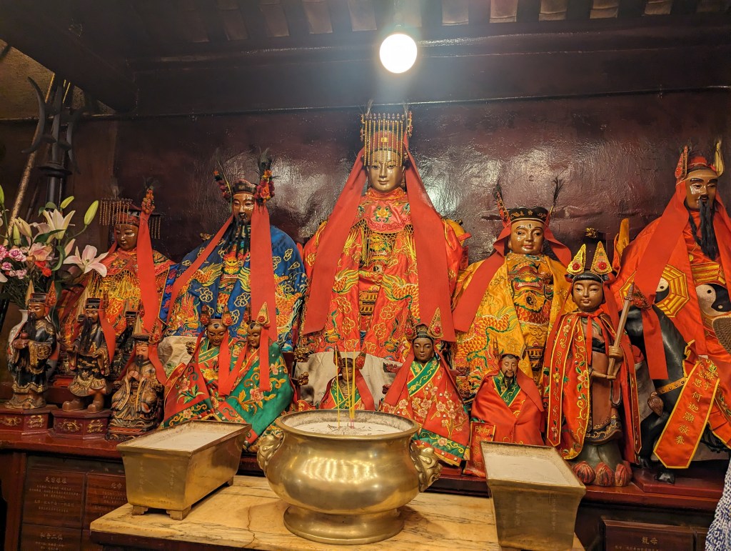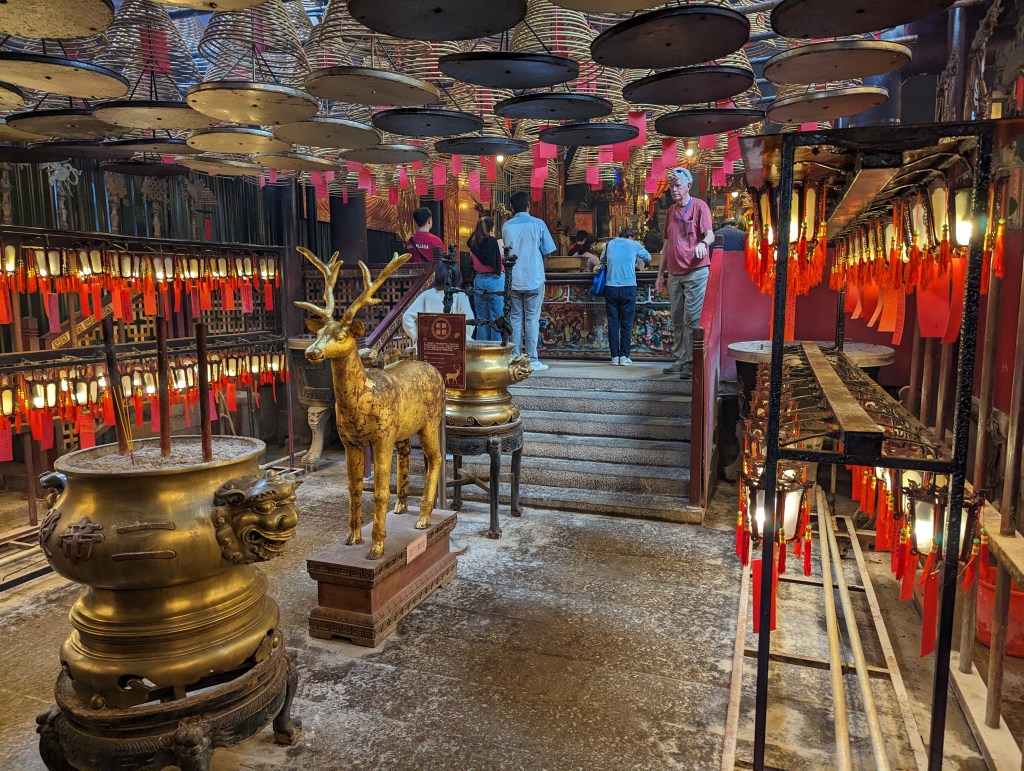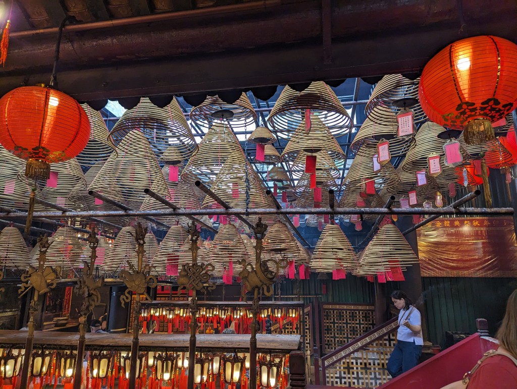 The MAN MO TEMPLE (1847) is a Taoist temple for worshipping two Deities: Man Cheong, the God of Civics or Literature; and Kwan Tai, the God of Martial Arts. The interior is wonderfully colorful and elaborately decorated, and also very smoky due to the burning incense coils hanging from the ceiling.