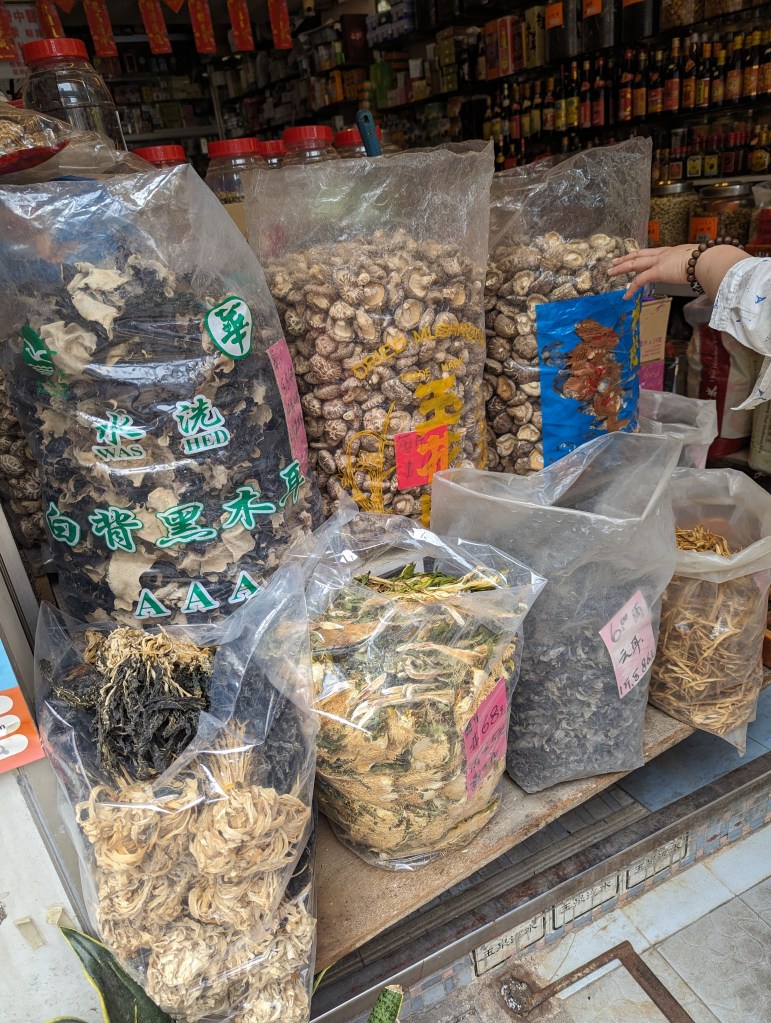 I love outdoor markets, especially foreign ones, because the offerings are unique to the area. Li Yuen Market vendors were selling fresh and dried fruit, dried fish and mushrooms, teas and herbs, flowers and liquor.
