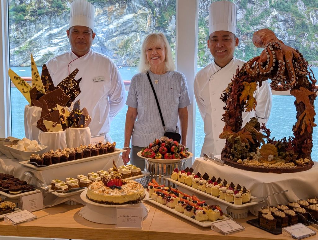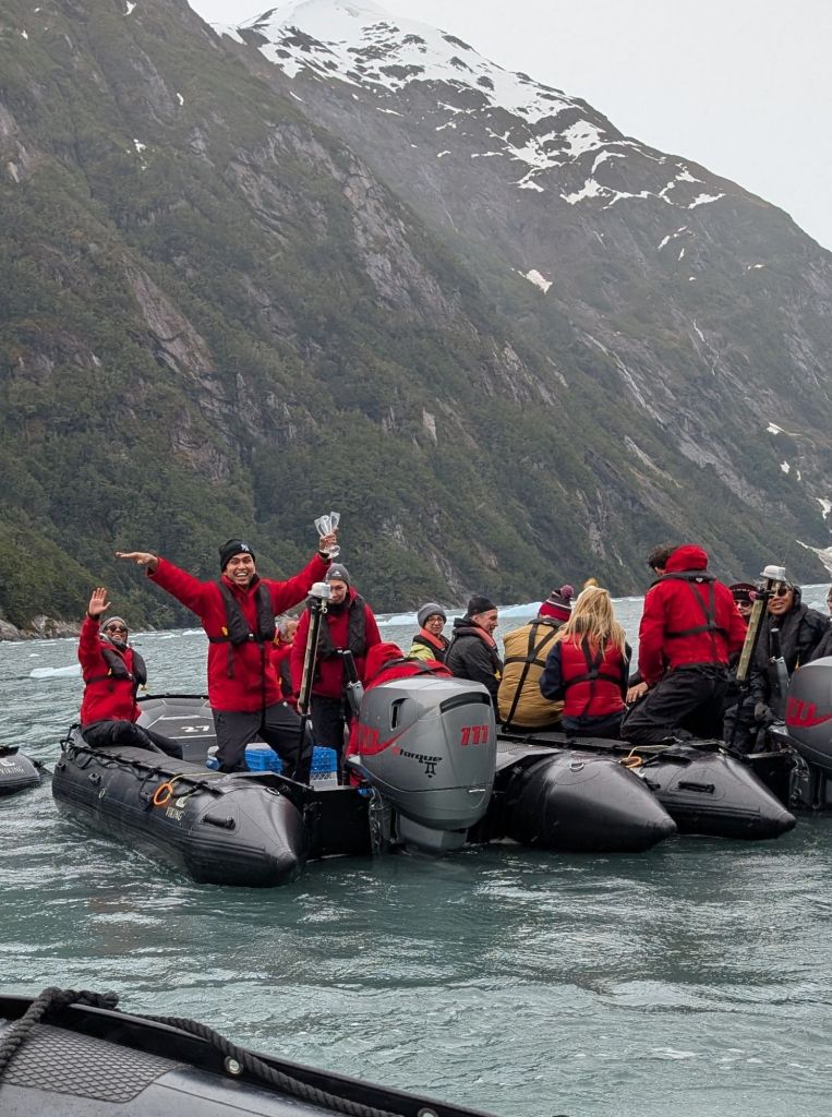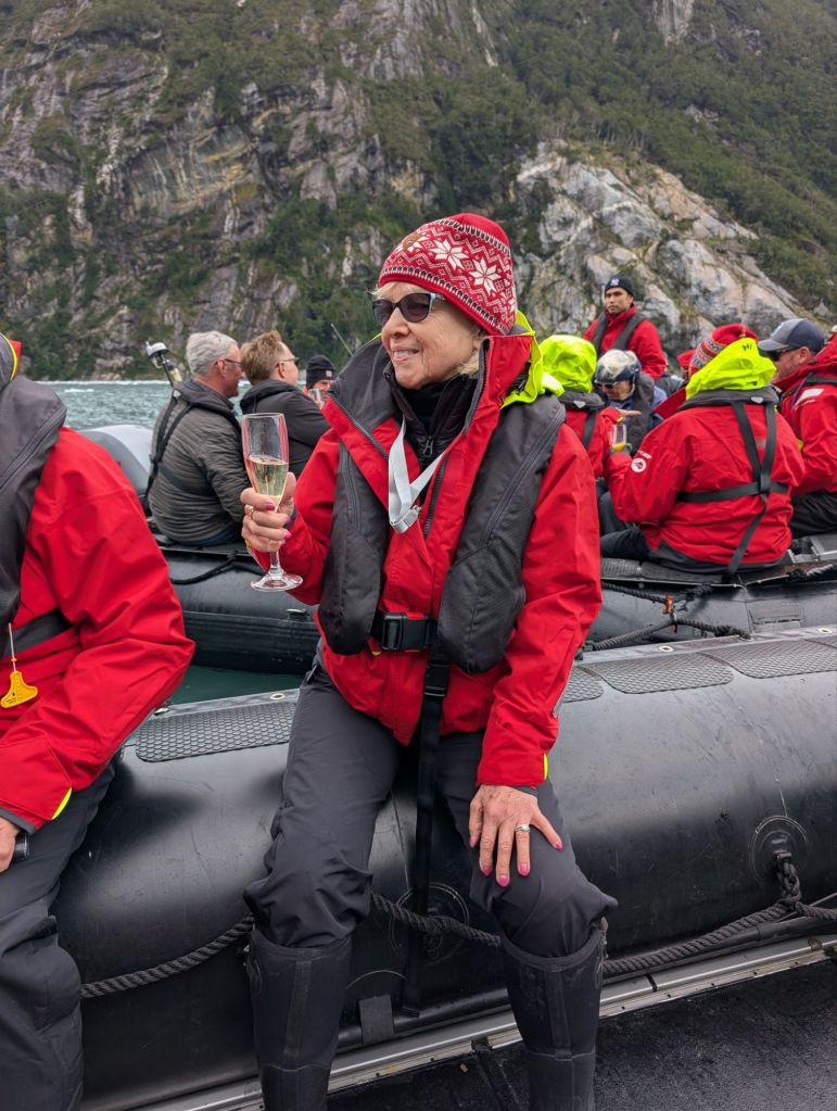 As we headed back to the ship, we met up with two other zodiacs to enjoy champagne. One of our favorite crew members, Cali, from the Philippines, waived to us from one of the zodiacs; he was in charge of serving the champagne.