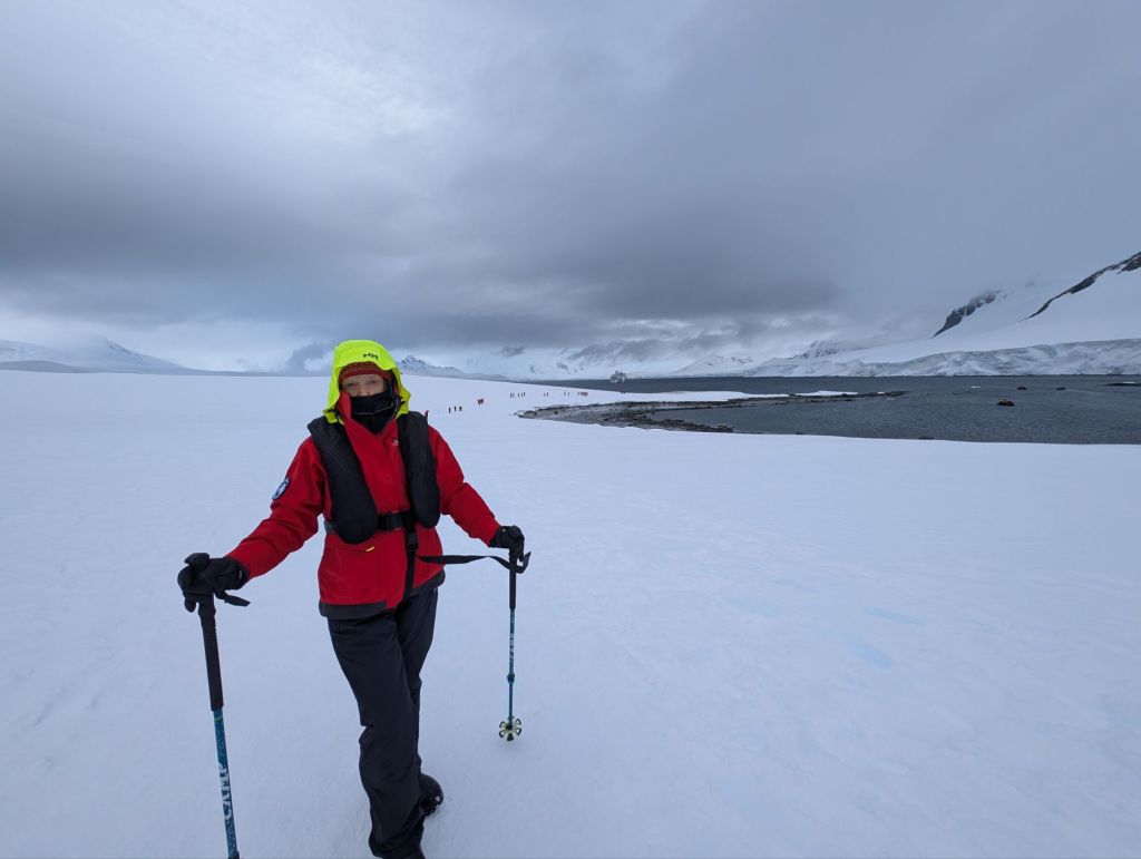 Viking Expedition Team members had landed at the site long before we arrived. They had carved out stairs in the ice and marked the path to the penguin rookery—where penguins nest—with crossed poles. Even with ski poles, the icy slippery path was not easy. I slipped and fell, but bounced back up.