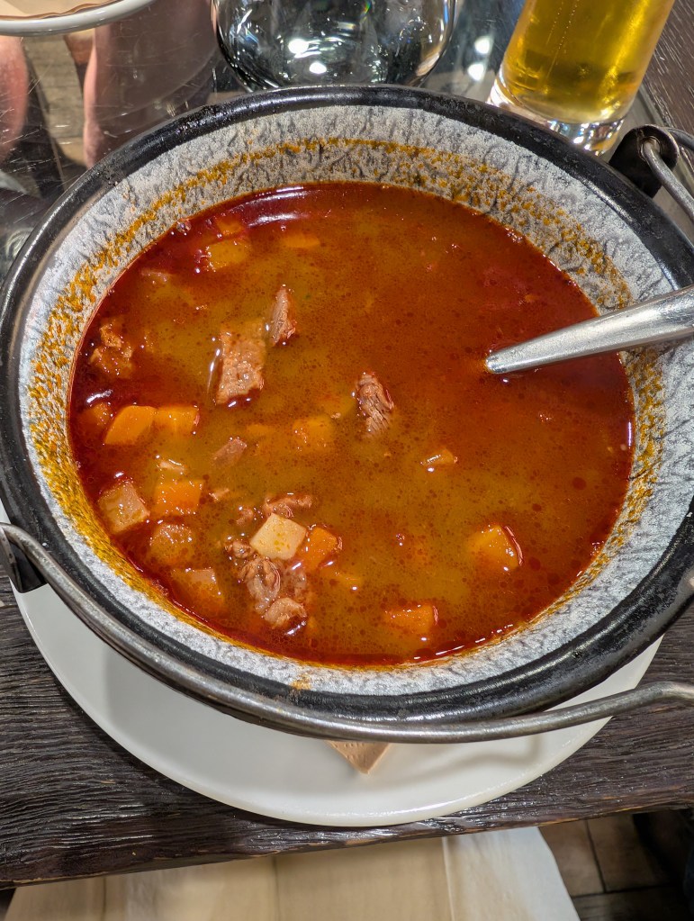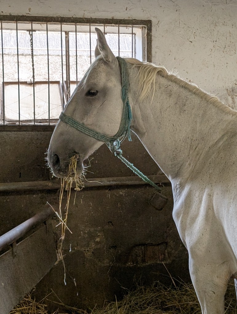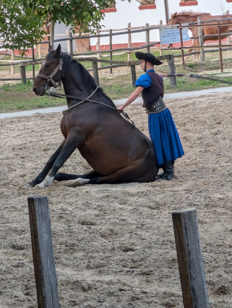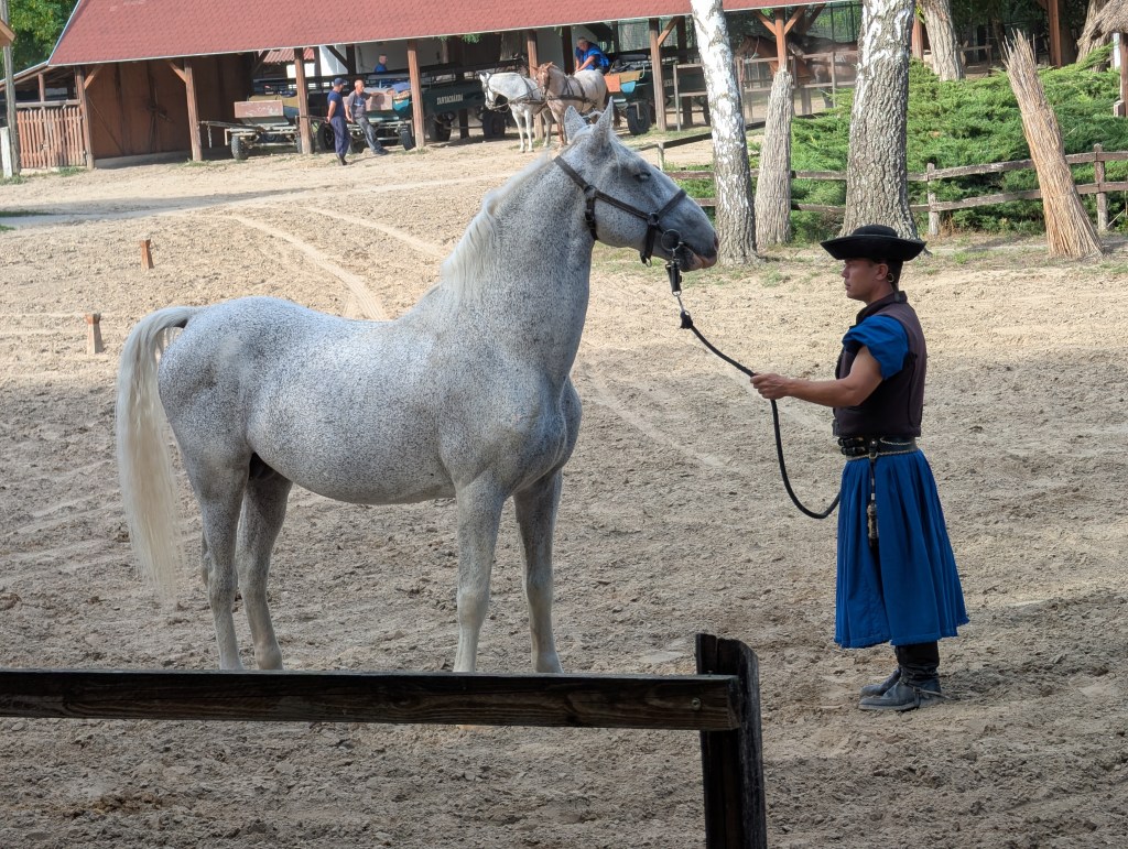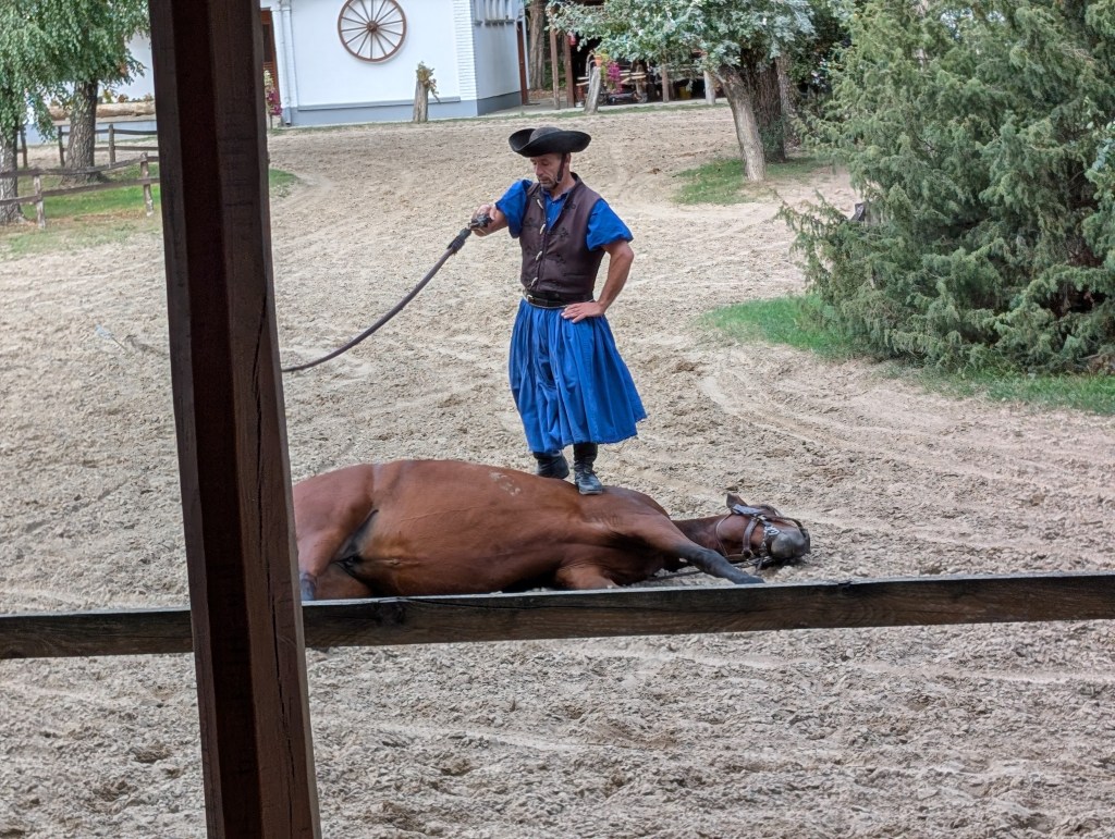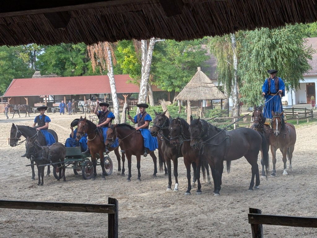 Traveled to the Tanyacsarda venue to watch a Puszta show, a traditional display of equestrian skills originating from the Great Hungarian Plain. The skills include the “Puszta-five,” where a rider stands on the backs of five horses, whip-cracking techniques, and having the horses sit, lie down, and stand on their hind legs. (Note: the horsemen do not whip their horses.)